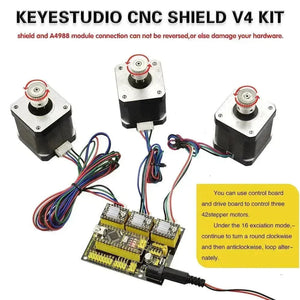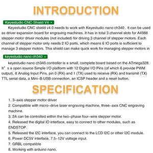 CNC shield v4.0 musí fungovat s nano ch340. Může být použit jako rozšiřující deska ovladače pro gravírovací stroje. Má celkem 3 kanálové sloty pro moduly ovladače krokových motorů A4988 (není součástí) pro ovládání 3 kanálů krokových motorů. Každý kanál krokového motoru potřebuje pouze 2 IO porty, což znamená, že 6 IO portů je dostatečných pro řízení 3 krokových motorů. Tento shield může rychle usnadnit řízení krokových motorů ve vašem projektu.