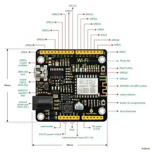 Deska keyestudio ESP8266 Wi-Fi Development Board je postavena kolem pokročilého modulu ESP8266-12 vyvinutého společností Ai-Thinker. Tato výkonná deska je navržena pro integraci Wi-Fi funkcí do vašich projektů, což ji činí ideální pro aplikace v rámci Internetu věcí (IoT).