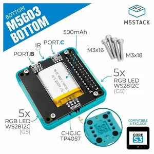 Jako třetí generace M5GO Bottom, M5GO3 Bottom je přizpůsoben pro M5CoreS3. Tento model nejen integruje funkce jako infračervenou vysílací LED, 500mAh lithiumovou baterii a RGB světla, ale je také kompatibilní s LEGO kostkami, což poskytuje více možností pro aplikace CoreS3.