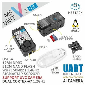 UnitV2 USB je nejnovější vysoce výkonný modul pro rozpoznávání AI od M5Stack, který využívá řídicí jádro Sigmstar SSD202D (integrovaný dvoujádrový procesor Cortex-A7 1,2GHz), 128MB DDR3 paměti a 512MB NAND Flash. Nabízí univerzální rozhraní USB-A, které umožňuje připojení různých UVC kamer, vestavěný operační systém Linux, integrované bohaté hardwarové a softwarové zdroje a vývojové nástroje, které vám přinášejí jednoduchý a efektivní zážitek z vývoje AI ihned po vybalení!