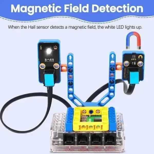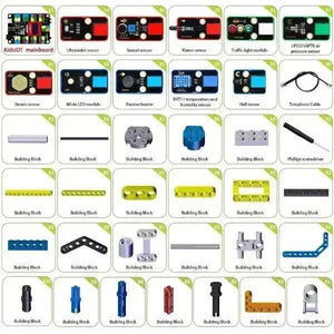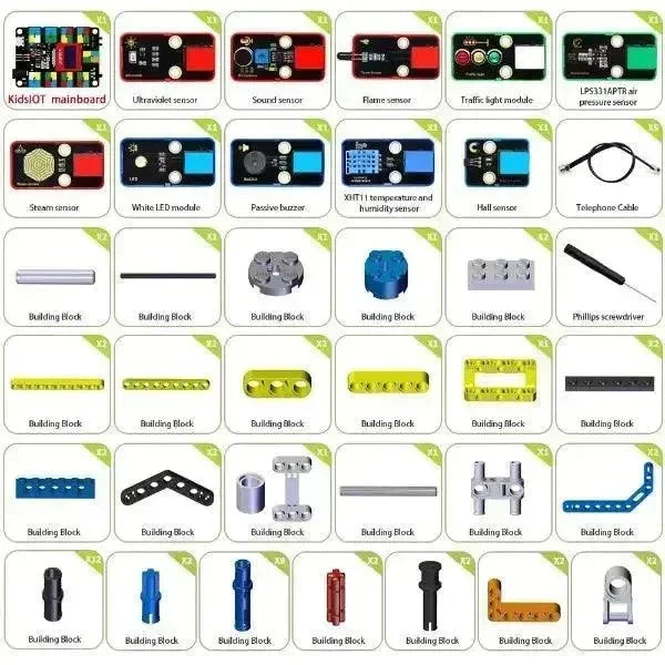 V této sadě je zahrnuto několik senzorů a modulů: bílý LED modul, Hallův senzor, pasivní bzučák, teplotní a vlhkostní senzor XH11, senzor páry, plamenný senzor, zvukový senzor, ultrafialový senzor, modul semaforu a senzor tlaku vzduchu. Kromě toho jsme navrhli sedm komplexních experimentů pro sadu s stavebnicovými bloky: detekce deště, požární alarm, detekce magnetického pole, detekce hromu, detekce teploty, detekce ultrafialového záření a detekce tlaku vzduchu. Tyto stavebnicové bloky jsou poskytnuty, takže můžete navrhovat formy podle libosti, což výrazně zlepšuje logickou analýzu, kreativitu, praktické dovednosti a schopnost řešit problémy.
