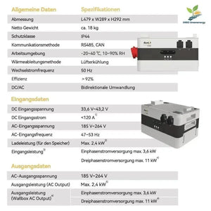 EV3600 zaujme svou inovativní obousměrnou nabíjecí funkcí. Umožňuje nejen využití uložené energie, ale také nabíjení energetického úložiště přes domácí síť - ideální pro úsporu nákladů v době nízkých cen elektřiny. Dva 230voltové konektory nabízejí flexibilní možnosti napájení domácích spotřebičů s výkonem až 2400 wattů. Navíc je integrováno speciální připojení pro Sunlit Aurora Wallbox, které umožňuje výkon 3,6 kW. To činí EV3600 ideálním řešením pro kombinaci solární energie a elektromobility.