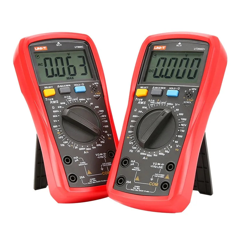 UNI-T UT890D+ er en del af den nye UT890-serie med 6000 tællinger, manuel rækkevidde og ægte RMS digitale multimetre, designet til at tilbyde brugerne et mere omfattende udvalg af funktioner og gennemtænkte alarmtjenester. Den har en ny automatisk sikringssprunget alarm og overspændings-/overstrømsadvarsler, specielt designet til at underrette brugerne om måleoverbelastning og sikringsstatus. Denne funktion hjælper også med at verificere, om en sikring er korrekt installeret. UT890D+ inkluderer både lavspændingsfrekvensmåling (under 30V, 10Hz~10MHz) og højspændingsfrekvensmåling (5V~750V, 10Hz~10kHz) for bedre håndtering af netfrekvensspændingsmålinger. Dens eksklusive LIVE enkelt-leder faselederdetektionsfunktion gør det muligt for brugere hurtigt at skelne mellem fase- og nulledere med kun én testledning. (Bemærk: Højpræcisions temperaturmåling er tilgængelig på UT890C, og denne model, UT890D+, fokuserer på faselederdetektion.)