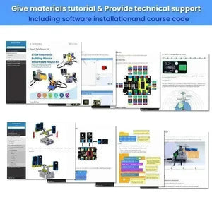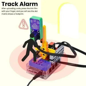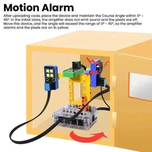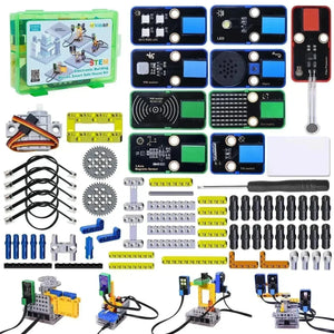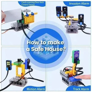 In diesem Kit sind mehrere Sensoren und Module enthalten: Weißes LED-Modul, 6812 RGB-Modul, HT16K33_8X8 Punktmatrix, Neigungssensor, 8002b Leistungsverstärker, Dünnfilm-Drucksensor, PIR-Bewegungsmelder, RFID-Modul, AK8975 3-Achsen-Magnetsensor und 270° Servo. Außerdem haben wir vier umfassende Experimente für das Kit mit Bausteinen entworfen: Karten-Scan Türschloss-Steuergerät, Einbruchsalarm, Spur-Alarm und Bewegungsalarm. Diese Bausteine werden bereitgestellt, sodass Sie Formen nach Belieben entwerfen können, was die logische Analyse, Kreativität, praktische Fähigkeiten und Problemlösungsfähigkeit erheblich verbessert.