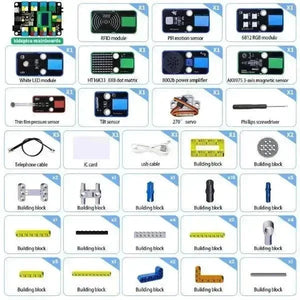 Enthält ein weißes LED-Modul, ein SK6812 RGB-Modul, eine HT16K33_8X8 Punktmatrix, Neigungssensor, 8002b Leistungsverstärker, Dünnfilm-Drucksensor, PIR-Bewegungssensor, RFID-Modul, AK8975 3-Achsen-Magnetsensor und einen 270° Servo.
