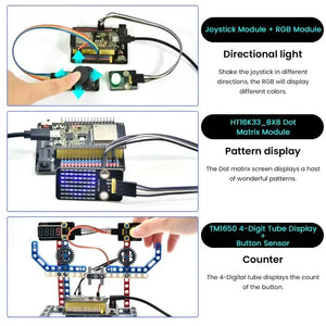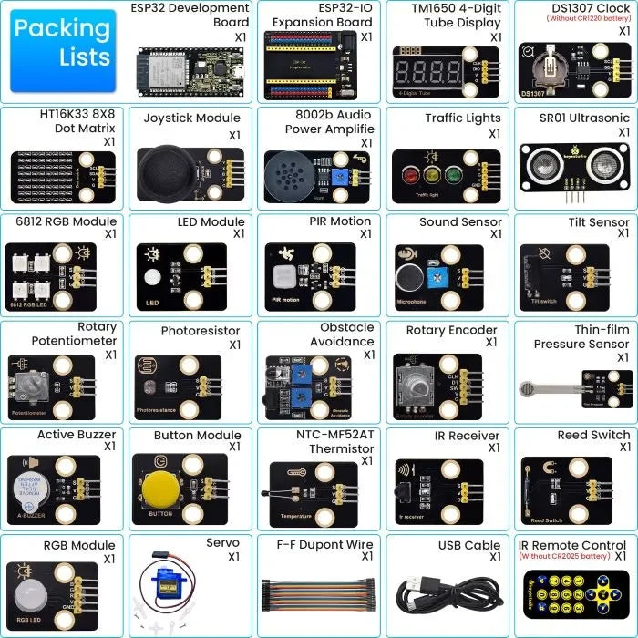 Das Keyestudio ESP32 24-in-1 Sensor Kit enthält 24 häufig verwendete Sensoren/Module, ein ESP32 Board, eine ESP32 Erweiterungsplatine und Dupont-Kabel. Alle 24 Sensoren und Module sind vollständig kompatibel mit der ESP32 Erweiterungsplatine. Stapeln Sie einfach das ESP32 Hauptboard auf die Erweiterungsplatine und verbinden Sie die Sensoren mit Dupont-Kabeln – ein Vorgang, der sowohl einfach als auch bequem ist. Um Ihnen beim Erlernen von Elektronikkenntnissen zu helfen, bietet das Kit detaillierte Tutorials (Arduino C), Schaltpläne, Verdrahtungsmethoden und Testcode. Durch praktische Projekte erhalten Sie ein tieferes Verständnis von Programmierung, Logik und Elektronik.