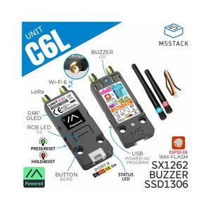 Unit C6L ist ein hochintegriertes LoRa®-Kommunikationsgerät, aufgebaut um das Stamp C6LoRa-Modul mit dem ESP32-C6 als Kerncontroller. Es integriert den SX1262 LoRa-Transceiver und RF-Schaltkreise und unterstützt einen weiten 868 ~ 923 MHz Frequenzbereich für robuste drahtlose Kommunikation. 📡