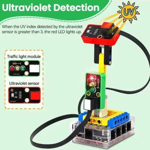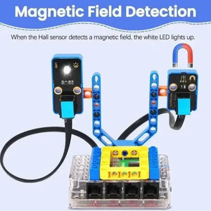 In diesem Kit sind mehrere Sensoren und Module enthalten: weißes LED-Modul, Hall-Sensor, passiver Summer, XH11-Temperatur- und Feuchtigkeitssensor, Dampfsensor, Flammensensor, Schallsensor, Ultraviolettsensor, Ampelmodul und Luftdrucksensor. Darüber hinaus entwerfen wir sieben umfassende Experimente für den Bausatz mit Bausteinen: Regenerkennung, Feueralarm, Magnetfelderkennung, Donnererkennung, Temperaturerkennung, Ultravioletterkennung und Luftdruckerkennung. Diese Bausteine werden bereitgestellt, sodass Sie Formulare nach Belieben entwerfen können, was die logische Analyse, Kreativität, praktische Fähigkeiten und Problemlösungsfähigkeiten erheblich verbessert.