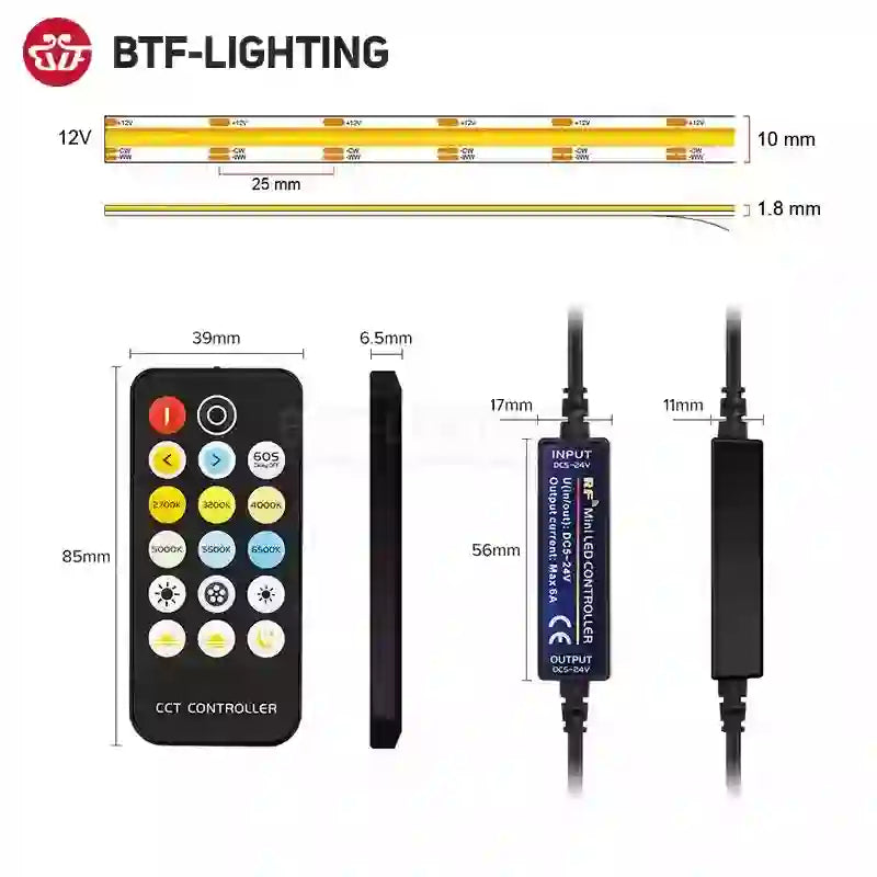 Transform your space with the BTF-Lighting COB CCT Adjustable White LED Strip, designed to offer unparalleled flexibility and superior light quality. This innovative Chip-On-Board (COB) LED strip allows you to effortlessly switch between warm white and cool white, creating the perfect ambiance for any occasion, from cozy evenings to productive tasks. Its advanced COB technology ensures a continuous, dot-free glow, providing a professional and uniform lighting effect that enhances any environment.