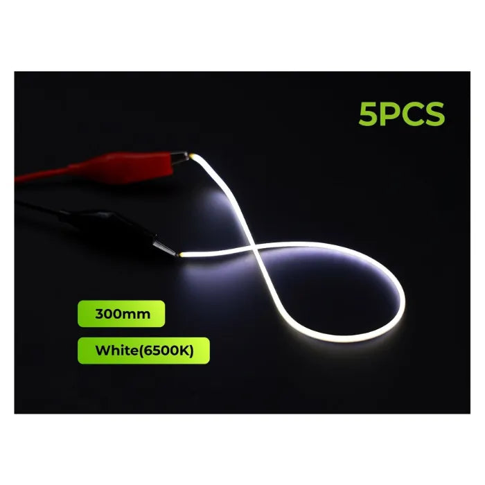 ✨ This pack contains 5 pieces of 1mm Ultra-Thin Double-Ended COB LED Filaments (300mm). ⚡ The double-ended power design ensures consistent high-intensity brightness across long spans. Ultra-flexible and uniform, these COB LED strips bend 360° 🌐 to trace complex shapes—delivering smooth, continuous light for bold contours and creative installations. 🔧 Each strip comes with DIY connecting wires (Total 10 wires).