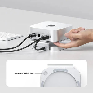Hay un orificio reservado en la parte inferior del botón de encendido para un inicio fácil del Mac mini.