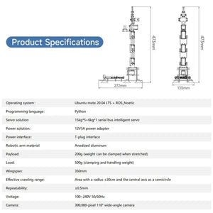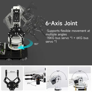Incluye un módulo de cámara de 30MP, una placa de expansión multifunción, servos de bus 5*15KG + 1*6KG, y todo el brazo robótico está hecho de aluminio anodizado blanco, que es hermoso y duradero.