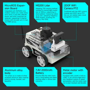 Esto robot educativo ROS para coches migra tareas de computación complejas a un entorno de máquina virtual PC, eliminando la necesidad de un placa de desarrollo embebida (Jetson NANO/Raspberry Pi) como el controlador principal. Los datos generados por el coche se transmiten de forma remota a la sistema de máquina virtual PC a través de Co-procesador ESP32 usando MicroROS WIFI UDP, realizando cálculos y generando decisiones. Yahboom proporciona 4 motores codificadores 310, un Batería de alta capacidad de 7.4V, un profesional Placa de control MicroROS, Lidar TOF, y otros accesorios, combinados con el Sistema operativo ROS2-Humble y Programación en Python3 para habilitar Evitación de obstáculos, Seguimiento, Mapeo/navegación, Simulación RVIZ, Control de sincronización multi-máquina, y Integración RVIZ/APP.