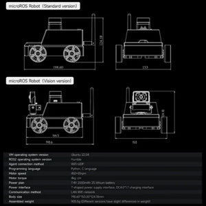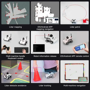 - Se soportan funciones como evitación de obstáculos con Lidar, seguimiento, mapeo/navegación, simulación RVIZ, control de sincronización multi-máquina, control remoto APP/mando, y otras.