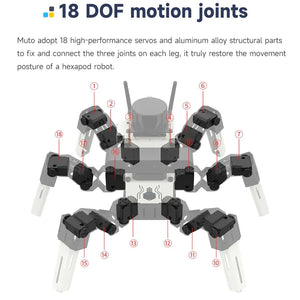 Muto RS on pöytätason bioninen kuusijalkainen robotti, joka on huolellisesti kehitetty ja suunniteltu tehokkaan ROS2-käyttöjärjestelmän ympärille. Se on yhteensopiva sekä Jetson NANOn että Raspberry Pin kanssa, tarjoten joustavuutta erilaisiin kehitystarpeisiin. Kokonaisrakenne on valmistettu kestävästä alumiiniseoksesta ja sisältää 18 kpl 35KG sarjaväyläservoa, syvyyskameran, lidar-laitteen ja äänimoduulit.