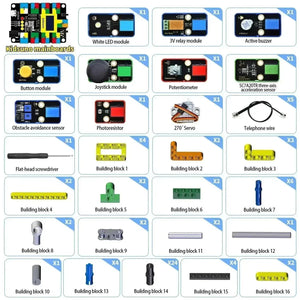 🧱 Le kit comprend un ensemble riche de 13 capteurs et modules et prend en charge six modes interactifs utilisant des blocs de construction :