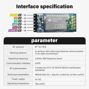 Il modulo Bluetooth DX-BT24 5.1 è costruito per la trasmissione dati wireless intelligente. Utilizza il Chip DAILOG 14531, configurato con 256 KB di spazio e segue le specifiche Bluetooth BLE V5.1. Supporta le istruzioni AT, gli utenti possono modificare la velocità della porta seriale, il nome del dispositivo e altri parametri secondo necessità, uso flessibile. Questo modulo supporta l'interfaccia UART e supporta la porta seriale Bluetooth trasmissione, con i vantaggi di basso costo, volume ridotto, basso consumo energetico, elevata sensibilità di invio e ricezione, dotata solo di pochi elementi periferici per ottenere le sue potenti funzioni.