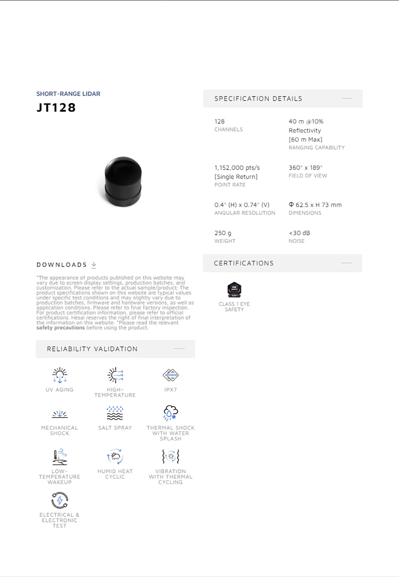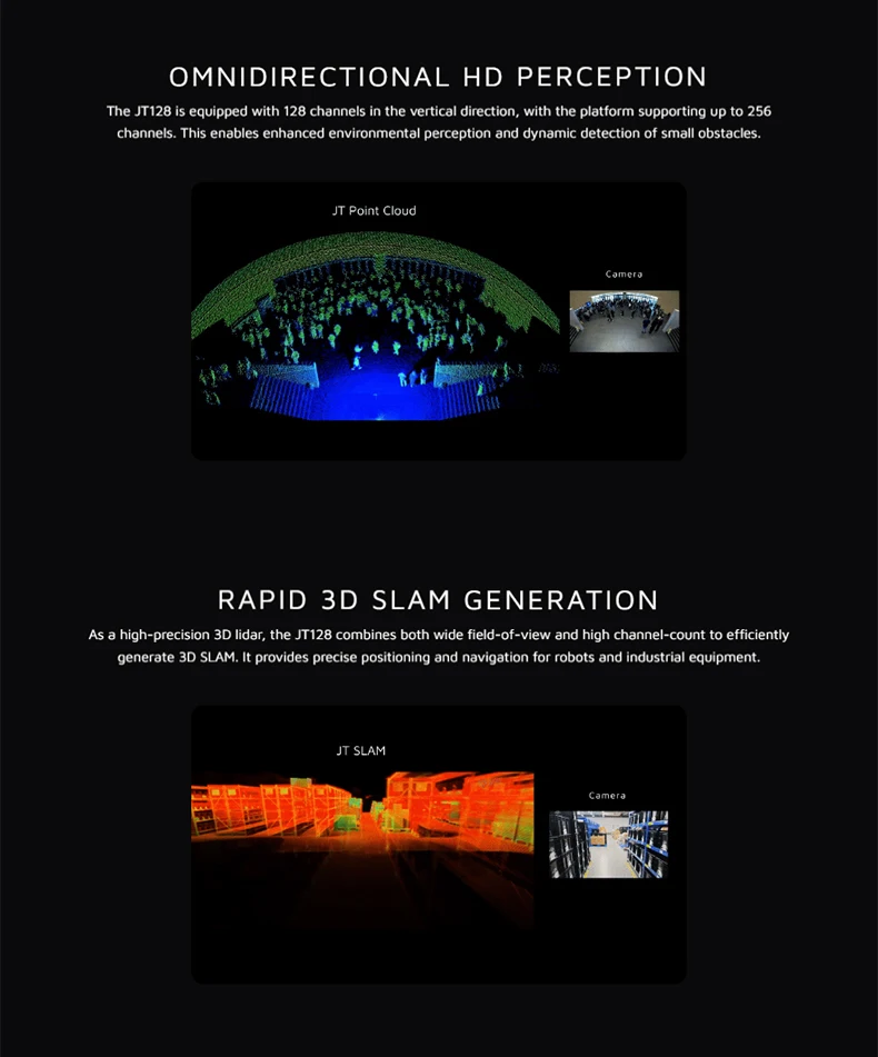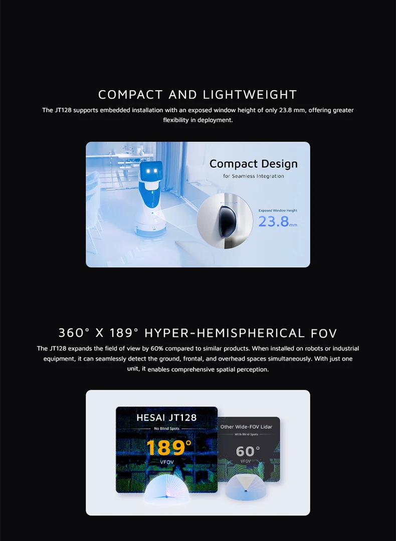 The HESAI JT128 is a high‑precision hemispherical 3D LiDAR, offering an ultra‑wide 360° × 189° field of view, 128 laser channels, and a dual‑return point rate of up to 2.3M pts/s. Engineered for AGV, AMR, robotics, mapping, and autonomous navigation, it delivers reliable performance even in complex indoor and outdoor environments, making it ideal for advanced perception tasks.