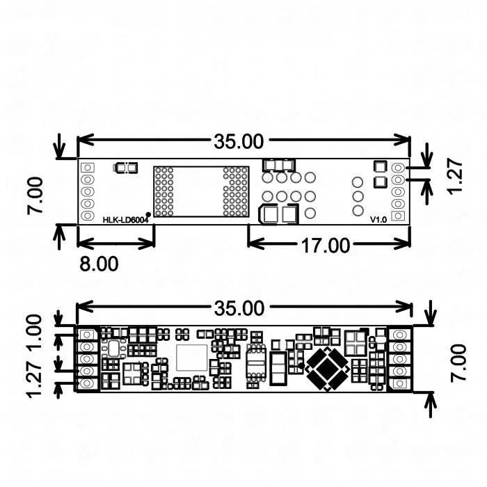 The HLK‑LD6004 is a high‑precision 60 GHz FMCW millimeter‑wave radar module developed by Hi‑Link, built on the advanced ADT6101P chipset. It integrates a 57–64 GHz RF transceiver, a 2T2R AIP antenna, 1 MB Flash, a dedicated radar signal‑processing unit, and an ARM Cortex‑M3 core. Using FMCW signal processing and advanced radar algorithms, the LD6004 supports multi‑target 3D human presence detection, capable of identifying movement, micro‑motion, and stationary human bodies while outputting real-time x/y/z coordinates for up to 3 targets. Its ±60° wide beam, UART/GPIO output, and compact 25 × 31.5 mm form factor make it ideal for smart home, lighting, security, and professional indoor sensing applications.
