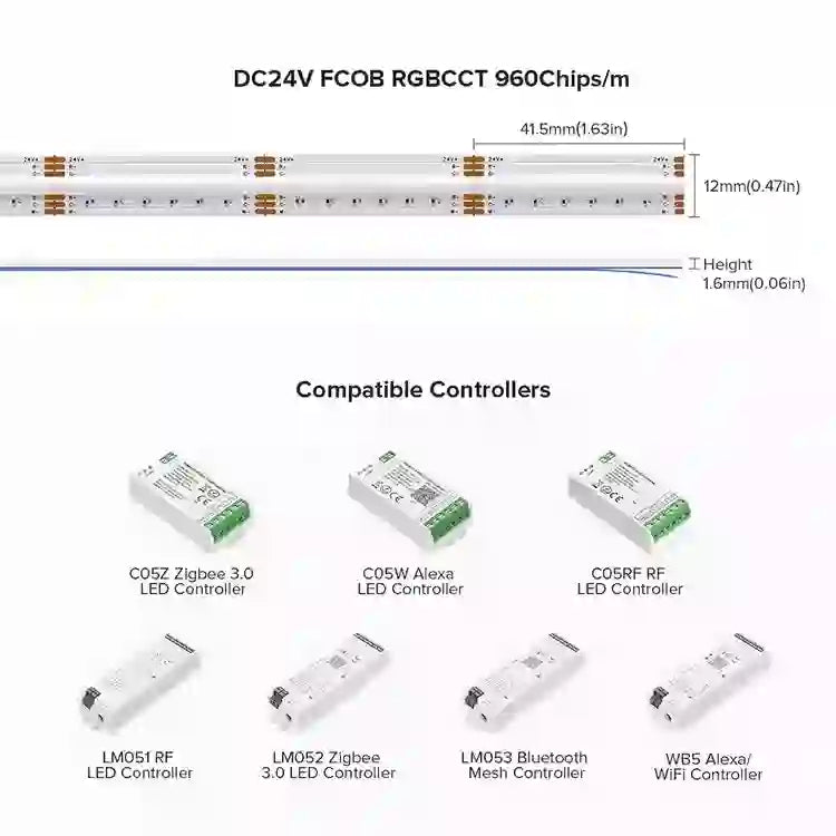 - Model: FCOB RGBCCT Ultra-Thin LED Strip Light (24V Adhesive Type)