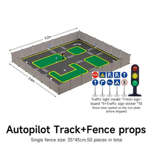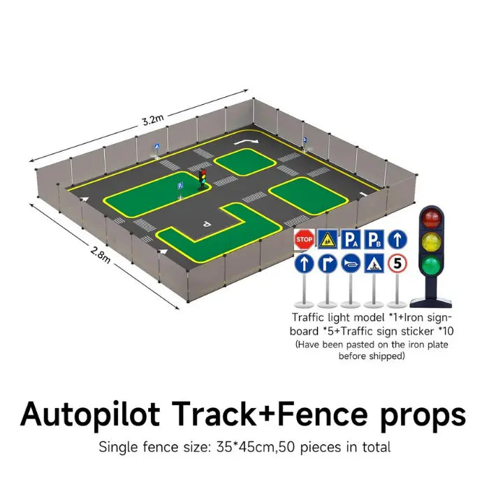 Supporting Accessories: Comes with 5 double-sided traffic signs (18cm), 1 traffic light (24cm), and 50 fences (35×45cm) to simulate real-world traffic conditions.