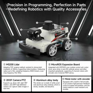 - Dotato di scheda di espansione robot ESP32-Micro ROS, motori encoder 310, lidar MS200, telecamera PTZ 2DOF, raffreddatore Pi 50 e altro hardware.
