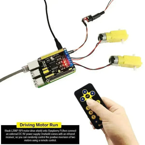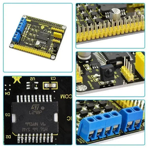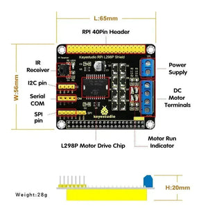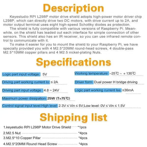Keyestudio RPI L298P motoraandrijfschild maakt gebruik van krachtige motordriverchip L298P, die direct twee DC-motoren kan aandrijven, met een aandrijfstroom tot 2A, en de motoruitgangsterminal gebruikt acht snelle Schottky-diodes als bescherming.