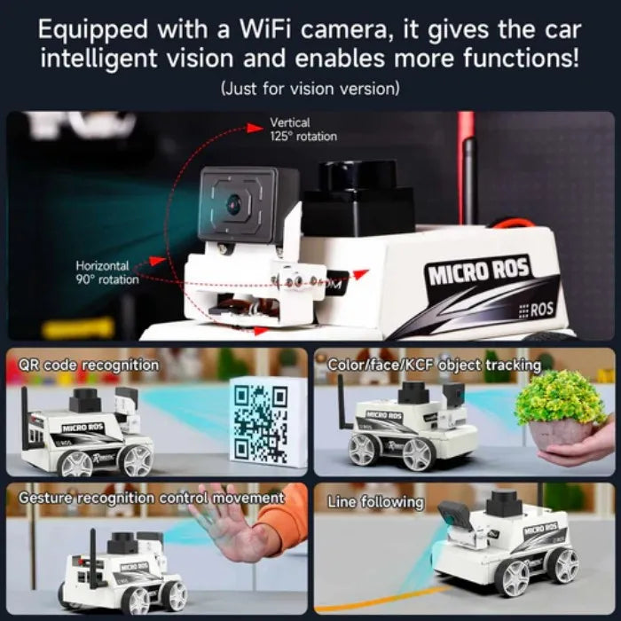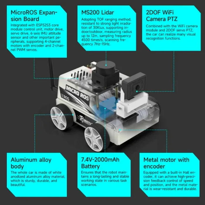 Dit ROS educatieve robotauto verplaatst complexe rekentaken naar een PC virtuele machineomgeving, waardoor een embedded ontwikkelbord (Jetson NANO/Raspberry Pi) als de hoofdcontroller. Gegevens die door de auto worden gegenereerd, worden op afstand verzonden naar de PC virtuele machinesysteem via de ESP32 co-processor gebruikend MicroROS WIFI UDP, berekeningen uitvoeren en beslissingen nemen. Yahboom biedt 4 STUKS 310 encoder motoren, een 7,4V hoogcapaciteitsbatterij, een professionele MicroROS besturingskaart, TOF lidar, en andere accessoires, gecombineerd met de ROS2-Humble besturingssysteem en Python3 programmering om in te schakelen obstakelvermijding, volgen, mapping/navigatie, RVIZ simulatie, multi-machine synchronisatiebesturing, en RVIZ/APP integratie.