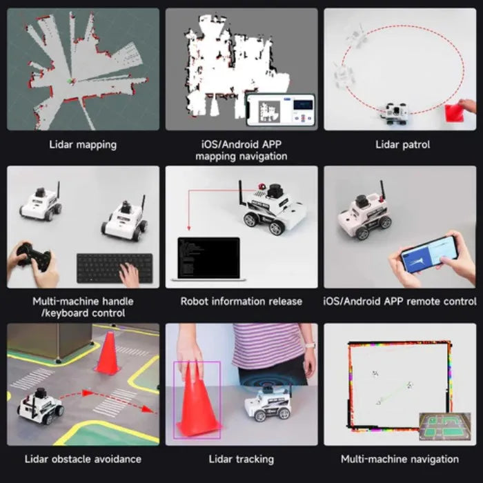 - Lidar obstakelvermijding, volgen, mapping/navigatie, RVIZ simulatie, multi-machine synchronisatiebesturing, APP/handvat afstandsbediening en andere functies worden allemaal ondersteund.