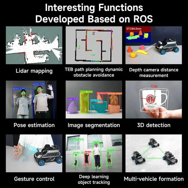 - Gecombineerd met een hoog koppel metalen 520-motor, ROS-uitbreidingsbord en lithiumbatterij met grote capaciteit, wat krachtige en langdurige bewegingsmogelijkheden biedt, evenals nauwkeurige 3D-wereldperceptie.