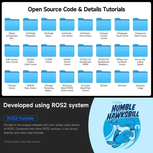- Gecombineerd met een hoog koppel metalen 520-motor, ROS uitbreidingsbord en grote lithiumbatterij, wat krachtige en langdurige bewegingsmogelijkheden biedt, evenals nauwkeurige 3D-wereldperceptie.