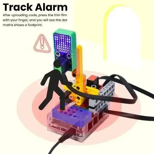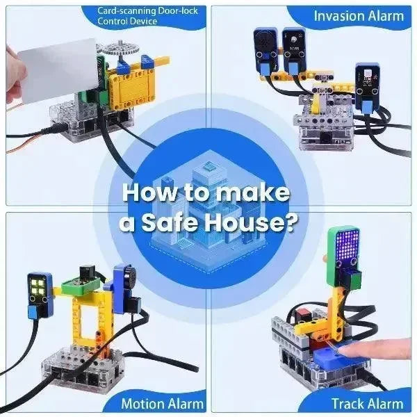 W tym zestawie znajduje się wiele czujników i modułów: biały moduł LED, moduł 6812 RGB, matryca punktowa HT16K33_8X8, czujnik przechyłu, wzmacniacz mocy 8002b, cienkowarstwowy czujnik ciśnienia, czujnik ruchu PIR, moduł RFID, magnetyczny czujnik 3-osiowy AK8975 oraz serwomechanizm 270°. Ponadto zaprojektowaliśmy cztery kompleksowe eksperymenty do zestawu z klockami konstrukcyjnymi: Urządzenie do kontroli zamka drzwiowego z czytnikiem kart, Alarm inwazji, Alarm toru oraz Alarm ruchu. Te klocki konstrukcyjne są dostarczone, więc możesz dowolnie projektować formy, co znacznie poprawia analizę logiczną, kreatywność, umiejętności praktyczne i zdolność rozwiązywania problemów.