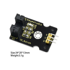Moduł Keyestudio Photo Interrupter to wszechstronny czujnik zaprojektowany do zastosowań w wykrywaniu obiektów. Wyposażony w emiter podczerwieni oraz osłonięty detektor podczerwieni, ten moduł może wykrywać obiekty poprzez emisję wiązki światła podczerwonego. Jest idealny do różnych zastosowań, w tym optycznych wyłączników krańcowych oraz dozowania peletów.