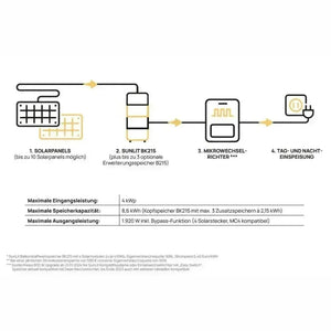 - Rozszerzenie solarne Plug-in: Rozszerzalne do 4 kWp i 8,6 kWh bez dodatkowych kosztów instalacji