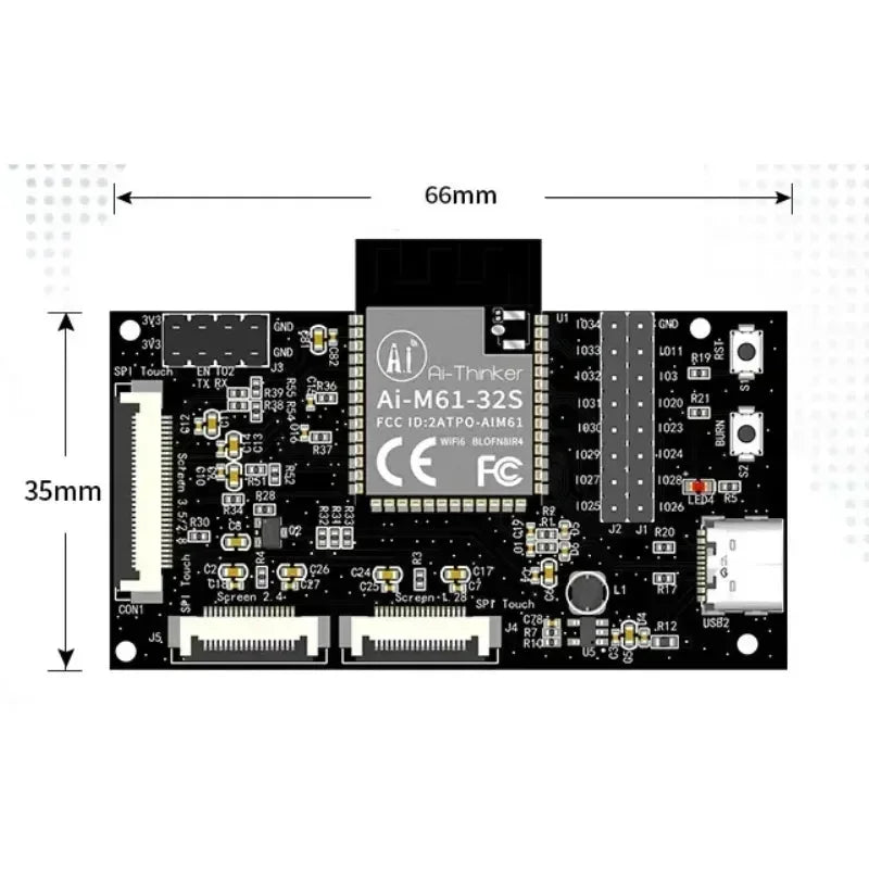 AiM61-325 screen driver development board, support for 2.8/3.5-inch and other 30PinSPI, 2.4-inch and 128-inch and other 18PinSPI display. At present, the test has passed the 3.5-inch capacitive touch screen and 1.28-inch round capacitive touch screen. The Ai-M61-32S module equipped with AiPi-DSL has rich peripheral interfaces, including DVP, MJPEG, Display, AudioCodec, USB2.0, SDU, Ethernet (EMAC), SD/MMC (SDH), SPI, UART, I2C, I2S, PWM, GPDAC, GPADC, ACOMP, and GSPIO.