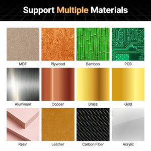 Supported Materials: Wood, MDF, bamboo, PCB, aluminum, copper, brass, resin, nylon, carbon fiber, acrylic