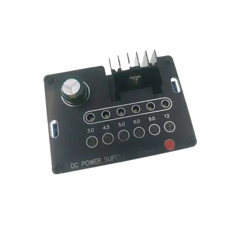 - Push-Button Voltage Control: Allows switching between six fixed voltage outputs—3V, 4.5V, 5V, 6V, 9V, and 12V.