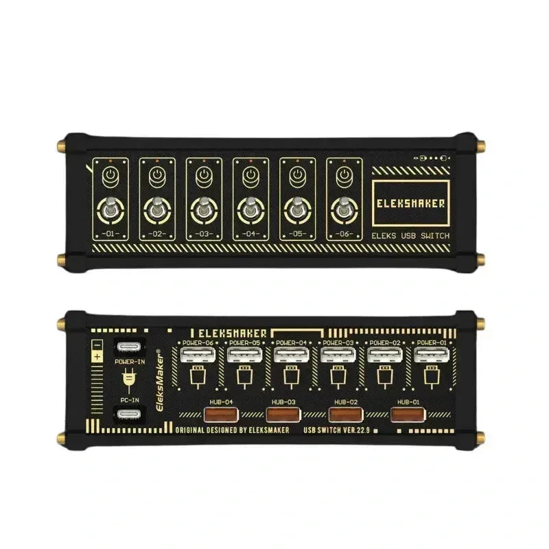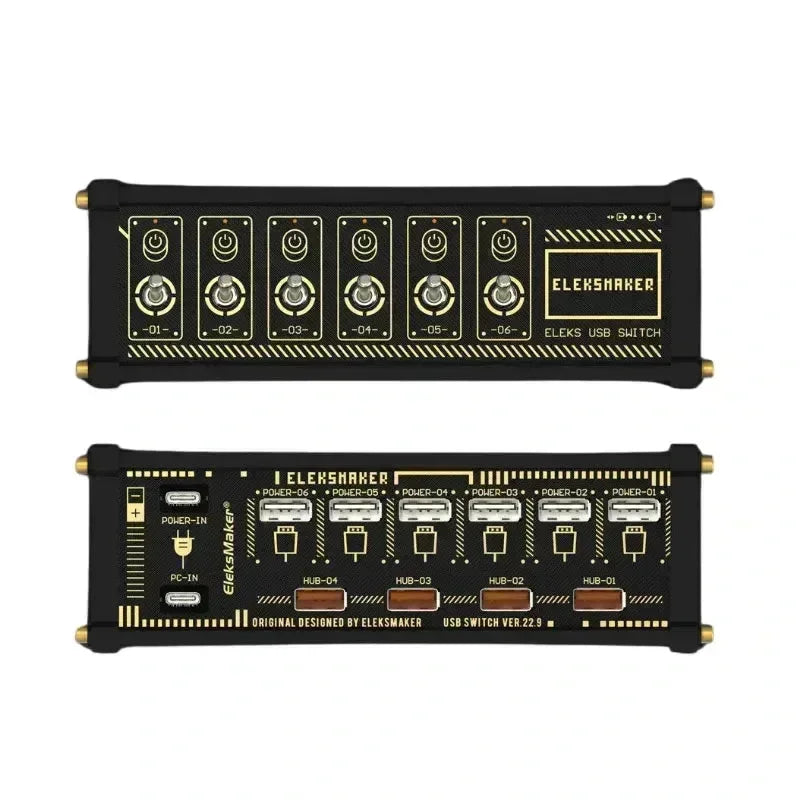 As pioneers in modular switch technology, our team at ELEKSMAKER took a bold step in 2021 by designing and releasing the market's first modular USB switch, the KG01. This innovative product featured six metal button switches controlling six USB power output channels. Its unique combination of an aluminum alloy structure and a black immersion gold circuit board presented a hard-core, mechanical appearance that was both understated and luxurious, setting the trend in the desk setup community.