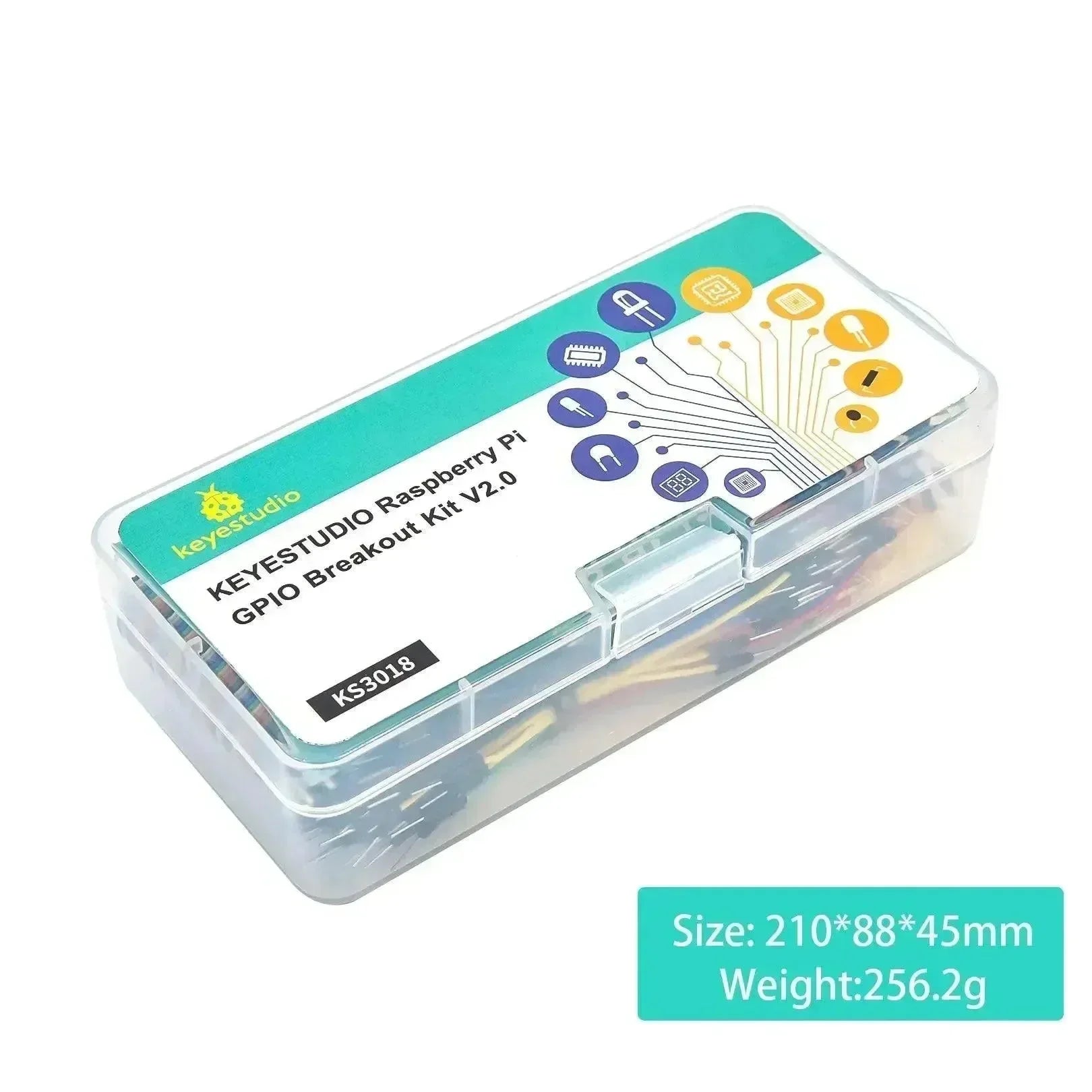 This basic GPIO extension board kit includes an 830-hole breadboard, T-type breakout adapter, LEDs, male-to-male jumper wires and more to complete the projects.