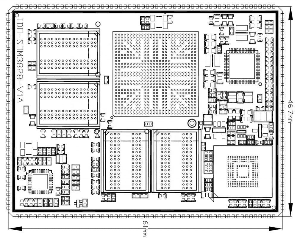 IDO-SOM3828 is an ultra-small SOM (System On Module) based on the Rockchip RK3288 SoC (ARM Cortex A17 Quad-Core clocked at 1.8G). The module integrates 4 DDR3L, 1 EMMC, 1 Gigabit Ethernet PHY (RTL8211F) and PMIC (RK808-B) on a 6 x 4.6 CM PCB, which features powerful multi-thread computing capability, graphics processing capability and hardware decoding capability, and supports Android (7.1 and above), Ubuntu and Debian systems.