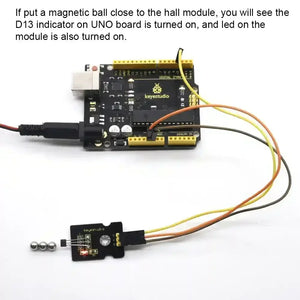 The Keyestudio Hall Magnetic Sensor is an essential component designed for detecting magnetic materials within a range of up to 3 cm. Utilizing the SFE Reed Switch technology, this sensor offers reliable digital on/off output based on the strength of the magnetic field.