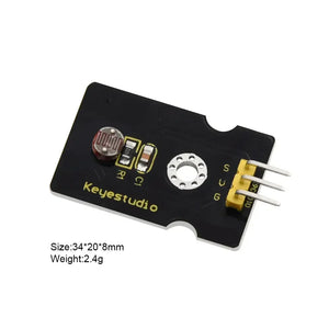 The Keyestudio Photocell Module is designed for light detection and is commonly used in intelligent switches and various electronic applications. This high-sensitivity photocell offers quick responses and consistency across different environmental extremes, including high temperatures and humidity. Perfect for automated control systems, this module is essential for enhancing project functionality,including cameras, garden solar lights, lawn lamps, money detectors, quartz clocks, music cups, gift boxes, and mini night lights.