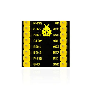 TB6612FNG motor driver can control up to two DC motors at a constant current of 1.2A (with a 3.2A peak). It uses two input signals (IN1 and IN2) to operate the motors in four modes: CW, CCW, short-brake, and stop. Each motor output (A and B) can be controlled separately, with speed adjustment via a PWM input signal of up to 100 kHz.
