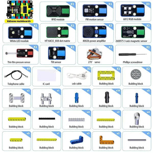 In this kit, multiple sensors and modules are included: white LED module, 6812 RGB module, HT16K33_8X8 dot matrix, tilt sensor, 8002b power amplifier, thin film pressure sensor, PIR motion sensor, RFID module, AK8975 3-axis magnetic sensor, and 270° servo. Besides, we design four comprehensive experiments for the kit with building blocks: Card-scanning Door-lock Control Device, Invasion Alarm, Track Alarm, and Motion Alarm. These building blocks are provided, so you may design forms at will, which greatly improves logical analysis, creativity, hands-on skills and problem-solving ability.