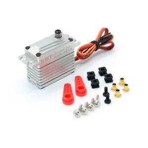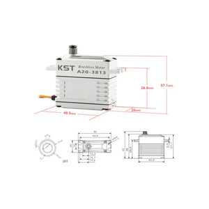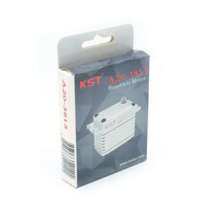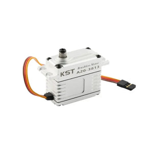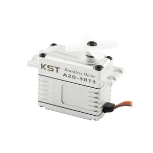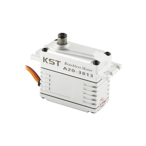 The KST A20-3813 V8 brushless HV servo. The digital brushless HV servo is very well suited for large "big scale" surface models of all kinds. The motor of the fast and extremely powerful KST servo can be loaded with up to 43Kgf.cm. The high-quality, all-aluminum housing can be mounted precisely and ensures good heat dissipation.