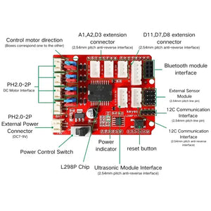 We have designed an expansion board based on the L298P circuit, which is stacked and can be directly plugged into the UNO R3 board. This design reduces the technical complexity for users in both motor driving and operation.