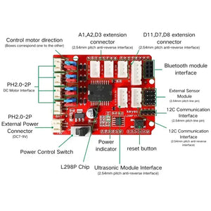 In addition, the expansion board includes a 2.54mm pitch header interface, which also serves as a serial communication interface. It is compatible with commonly used Bluetooth modules like HC-06 and HM-10. To facilitate connecting additional sensors or modules, the driver board also includes three XH-2.54mm 3P anti-reverse connectors, two XH-2.54mm 4P anti-reverse connectors, and one XH-2.54mm 5P anti-reverse connector. The expansion board expands two digital I/O ports, two analog I/O ports, and one I2C communication port via 2.54mm pitch pin headers. A reset button is also provided on the expansion board for easy resetting.