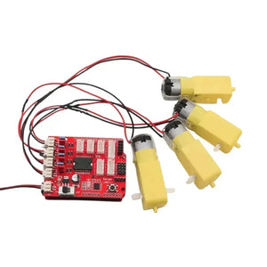 In the experiment, we use the UNOR3 development board and the motor driver expansion board to drive four motors to cycle back and forth.