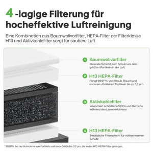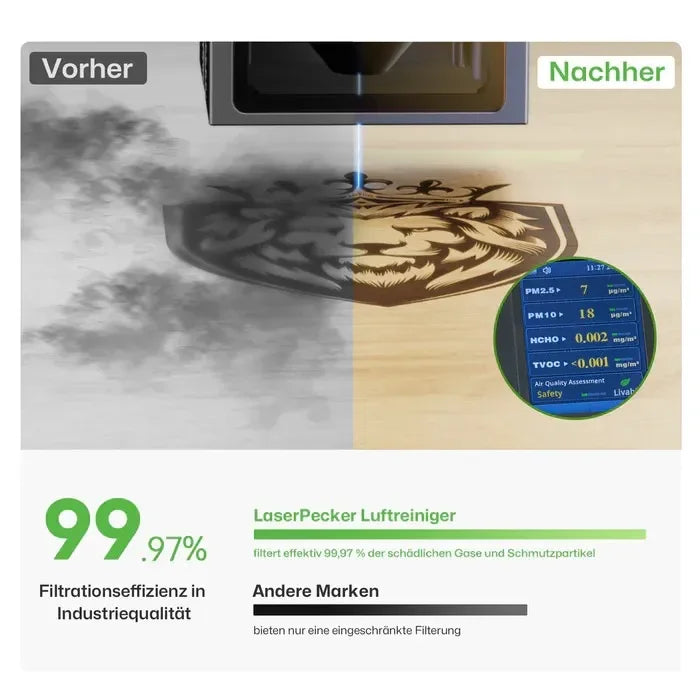 Together, these filters deliver highly effective air purification and remove 99.97% of all particles down to 0.3 μm that reach the H13 HEPA filter core. This helps protect your health during long engraving sessions and keeps your workspace air noticeably cleaner.