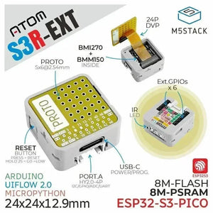 The AtomS3R Ext is a prototype development expansion programmable controller based on the ESP32-S3 main controller. It has been designed specifically for prototype validation and expansion development. The device features a prototype breadboard on the top surface, which allows users to connect and debug multiple input/output ports, thereby making it suitable for various peripheral module expansions and function validation. The device incorporates the ESP32-S3-PICO-1-N8R8 main controller, facilitates WiFi functionality, and comprises 8MB of onboard flash memory and 8MB of PSRAM, in addition to a power circuit that converts 5V to 3.3V/2.8V/1.2V. Additionally, the device is equipped with a three-axis BMM150 geomagnetic sensor and a six-axis BMI270 motion sensor. The controller is equipped with a Type-C interface for power supply and firmware downloads, as well as an HY2.0-4P expansion port, six GPIO, and power pins, which facilitate the expansion of functionality. In comparison to preceding ATOM series host products, the AtomS3R Ext boasts an advanced 3D antenna, which offers enhanced signal performance and stability. With dimensions of only 24x24x12mm, the device is particularly well-suited to prototype development and validation applications in embedded smart devices.